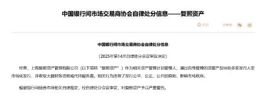 8月8日金融一线消息,中国银行间市场交易商协会发布自律处分信息:经查,上海复熙资产管理有限公司(以下简称“复熙资产”)作为相关资产管理计划管理人,通过自身管理的资管产品协助多家发行人非市场化发行,并收取大额财务资助或代持服务费。相关行为违背了发行公平、公正、公开的原则,影响市场秩序。